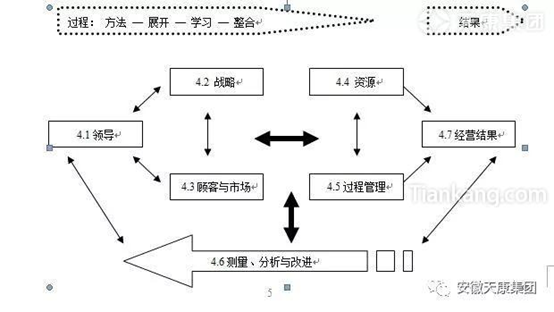 “4.1領(lǐng)導(dǎo)”、“4.2戰(zhàn)略”和“4.3顧客與市場(chǎng)”3部分構(gòu)成了“領(lǐng)導(dǎo)作用”三角,體現(xiàn)了“領(lǐng)導(dǎo)”、“顧客與市場(chǎng)”、“戰(zhàn)略”在組織績(jī)效管理系統(tǒng)中起到的驅(qū)動(dòng)作用;在圖的右側(cè)由“4.4”資源、“4.5過(guò)程管理”、“4.7經(jīng)營(yíng)結(jié)果”3部分構(gòu)成了“經(jīng)營(yíng)結(jié)果”三角,體現(xiàn)了在組織績(jī)效管理系統(tǒng)中,通過(guò)“資源”和“過(guò)程管理”追求“經(jīng)營(yíng)結(jié)果”;而“4.6測(cè)量、分析與改進(jìn)”是組織績(jī)效管理系統(tǒng)的基礎(chǔ),為提升組織的績(jī)效和競(jìng)爭(zhēng)力發(fā)揮著至關(guān)重要的作用,推動(dòng)著組織的改進(jìn)和創(chuàng)新。